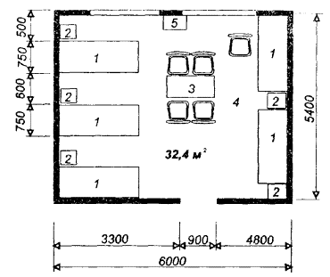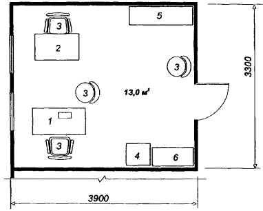 1 - стол работника МВД; 2 - стол помощника; 3 - стул; 4 - сейф; 5 - шкаф для бумаг; 6 - шкаф для канцелярских принадлежностей