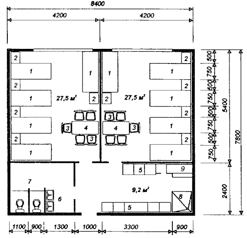 Вариант жилой ячейки на 10 человек 1 - кровать; 2 - тумбочка; 3 - стул; 4 - стол; 5 - встроенный шкаф; 6 - умывальник; 7 - уборная; 8 - душ; 9 - скамья