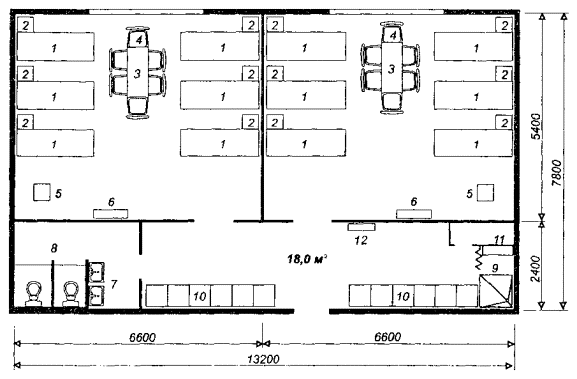 1 - кровать; 2 - тумбочка; 3 - стол; 4 - стул; 5 - стул для медсестры; 6 - шкаф; 7 - умывальник; 8 - санузел; 9 - душ; 10 - индивидуальные шкафы; 11 - кладовка для хозинвентаря; 12 - место для телефона-автомата ПРИЛОЖЕНИЕ А(справочное) ТЕРМИНЫ И ОПРЕДЕЛЕНИЯЖилая ячейка - элемент жилой группы учреждения временного пребывания лиц без определенного места жительства, состоящий из жилых комнат, подсобных помещений, санузла, передней. Жилая группа - составная часть здания учреждения временного пребывания лиц без определенного места жительства, включающая несколько жилых ячеек, коммуникационных пространств и необходимых подсобных помещений общественного назначения внутригруппового пользования. Санпропускник - совокупность бытовых, медицинских помещений с санитарно-гигиеническим оборудованием в учреждении временного пребывания для медицинского осмотра прибывших лиц, проведения их санитарной обработки и обеспечения чистой одеждой. ПРИЛОЖЕНИЕ Б(справочное) ПЕРЕЧЕНЬ ДОКУМЕНТОВ, НА КОТОРЫЕ ДАНЫ ССЫЛКИ В НАСТОЯЩЕМ СПСНиП 10-01-94 «Система нормативных документов в строительстве. Основные положения»; СНиП 21-01-97* «Пожарная безопасность зданий и сооружений»; СНиП 23-05-95 «Естественное и искусственное освещение»; СНиП 35-01-2001 «Доступность зданий и сооружений для маломобильных групп населения»; СНиП 2.04.01-85* «Внутренний водопровод и канализация зданий»; СНиП 2.04.05-91* «Отопление, вентиляция и кондиционирование»; СНиП 2.08.02-89* «Общественные здания и сооружения»; СНиП 31-01-2003 «Здания жилые многоквартирные» СП 31-103-99 «Здания, сооружения и комплексы православных храмов»; СП 35-104-2001 «Здания и помещения с местами труда для инвалидов»; СП 35-115-2002 «Обустройство помещений социального и медицинского обслуживания пожилых людей»; СП 41-104-2000 «Проектирование автономных источников теплоснабжения»; СП 12-95 «Инструкция по проектированию объектов ОВД (милиция) МВД России»; ГОСТ 12.1.004-91 «ССБТ. Пожарная безопасность. Общие требования»; СанПиН (СП) 2.3.6.1079-01 «Санитарно-эпидемиологические требования к организации общественного питания, изготовлению и оборотоспособности в них пищевых продуктов и продовольственного сырья»; ВСН 59-88 «Электрооборудование жилых и общественных зданий. Нормы проектирования»; НПБ 88-2001* «Установки пожаротушения и сигнализации. Нормы и правила проектирования». ПРИЛОЖЕНИЕ В(рекомендуемое) МИНИМАЛЬНЫЙ СОСТАВ ПОМЕЩЕНИЙ И ОБОРУДОВАНИЯ ПОМЕЩЕНИЙ УЧРЕЖДЕНИЙ ВРЕМЕННОГО ПРЕБЫВАНИЯТаблица В.1 - Социальная гостиница