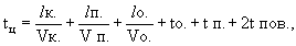 tц - продолжительность рабочего цикла, определяемая по формуле где lк., lп., lo. - соответственно длина пути копания, перемещения грунта и обратного хода бульдозера, м (в среднем lк. = 5 - 10 м; при расчете lп. - длина участка пути с подъемом от 10 до 20 % принимается с коэффициентом 1,2, а при подъемах более 20 % - 1,4; lo. = lк. + lп.); Vк., Vп., Vo. - соответственно скорости трактора при копании, перемещении грунта и обратном ходе (принимается по паспорту машины, равной скорости на I, II, III передачах); to. - время на опускание отвала (1,5 - 2,5 с); tп. - время на переключение передач (5 - 10 с); tпов. - время на поворот трактора (10 - 15 с). б) при планировочных работах
