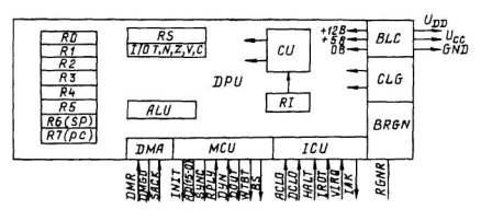 Таким образом, процессор адресует 64 кбайт или 32 кслов информации. Адресное пространство микроЭВМ делится на 8 блоков по 4К слов в каждом. В первом блоке находятся векторы прерываний, а в последнем - адреса регистров ввода-вывода. Каждый вектор прерывания занимает два слова, в первом хранится начальный адрес установки счетчика команд (после прерывания), а во втором - код установки регистра состояния (RS). В состав логического символа процессора входят: восемь регистров общего назначения (RO-R7), среди которых R6 играет роль указателя стека (SP), a R7 - счетчика команд (PC); регистр состояний (RS), включающий признаки: N - знака, Z - нуля, V - переполнения, С - переноса, Т - разряда слежения, I/O - приоритета программы, арифметико-логическое устройство (ALU); устройство управления (CU) с регистром команд (RI); устройства управления магистралью (MCU) с прямым допуском к магистрали (DMA); прерывания (ICU); блок питания (BLC); генератор синхронизации (CLG); блок управления регенерацией динамической памятью (BRGN).
