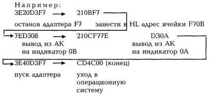 Дальнейший порядок действий оператора для запуска периодической задачи: в списке услуг "Видеотона" нажать цифру 6 далее └─┘ (пробел) ответ Code: (запрос кода задачи). Нужно выбрать любой код, кроме тех, которые уже есть. Например: 44 └─┘ Priority: (запрос приоритета). Ответ: 44 └─┘ ТСВ: (требуется отвести 2-е свободные строки, начиная с определенного адреса, например 2Е00) Ответ: 2Е00 └─┘ (символ пробела) stack: (требуется указать начало стека для задачи). Например: Ответ: 2EFF └─┘ программа Program: (запрос начального адреса нашей задачи). Ответ: 2D00 └─┘ (если текст задачи начинается с адреса 2D00). Таким образом производится описание Compose задачи через 6-ю услугу. Далее нужно задачу запустить. Это делается через 4-ю услугу: Нажать: 4 └─┘ Ответ: Code Напечатать: 44 └─┘ └─┘ └─┘ (три пробела) Ответ: В Напечатать период запуска задачи Например, ответ: 0001 └─┘ (1 - 100 мс) Задача запущена! Останов задачи через 7-ю функцию. Задача будет работать до тех пор, пока не произойдет рестарт либо останов ее через 7-ю функцию. Если требуется вывести на цифровые индикаторы ячейки ОЗУ какого-либо канального адаптера, то программа должна содержать в тексте останов и запуск адаптера с указанием его адреса.