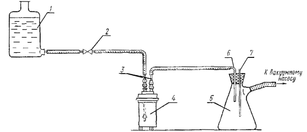 2.1.10. Вместимость калориметрической бомбы вычисляют как среднее арифметическое результатов пяти определений, расхождение между наибольшим и наименьшим значениями которых не должно превышать 0,5·10-6 м3. 2.1.11. Калориметрическую бомбу с полузавинченными вентилями и крышкой бомбы, предназначенную для работы с газом, оставляют всегда с осушающим реактивом на дне стакана. 2.2. Продувка и заполнение калориметрической бомбы испытуемым газом 2.2.1. Продувка и заполнение калориметрической бомбы газом могут осуществляться из любого источника газа: газопровода, газгольдера, пипетки, баллона под давлением и других. Газ из газопровода при избыточном давлении не выше 0,098 МПа (1 ати) и газгольдера отбирают газоотборной трубкой из нержавеющей стали, оборудованной двумя кранами, расположенными за точками отбора пробы, один из которых служит для продувки газоотборной линии в атмосферу в течение такого времени, чтобы сменился 10 - 15-кратный объем газа; другой для отбора газа на испытание. При избыточном давлении в газопроводе выше 0,098 МПа (1 ати) на газоотборной линии перед отбором газа устанавливают редуктор для снижения избыточного давления до 0,0098 - 0,0490 МПа (0,1 - 0,5 ати). При отсутствии подводки газа в помещение лаборатории пробу газа отбирают в металлические двухвентильные пробоотборники под давлением, соответствующим давлению в месте отбора, откуда потом газ вытесняется 22 %-ным раствором хлористого натрия или водой, насыщенной газом. 2.2.2. При продувке из металлических газовых пипеток вместимостью 10 - 12 дм3, изготовленных из устойчивого к окислению металла и снабженных с обоих концов трехходовыми или одноходовыми кранами, напорной склянкой служит склянка с тубусом вместимостью 10 - 20 дм3. 2.2.3. Для заполнения газовой пипетки ее устанавливают в подставке в вертикальном положении, соединяют резиновой трубкой нижний кран пипетки с краном водопровода и заполняют пипетку водой. По заполнении пипетки закрывают оба крана и разъединяют ее с водопроводом. Оставляя заполненную водой пипетку в подставке в вертикальном положении, соединяют ее верхний кран резиновой трубкой со штуцером, ведущим от газопровода или газгольдера, и, поворачивая трехходовой или серповидный кран на атмосферу, продувают соединительную трубку газом. Газопровод должен быть предварительно продут в атмосферу. Установив небольшую струю газа, открывают нижний кран пипетки и заполняют ее газом, постепенно сливая воду из пипетки небольшой струей. Когда вся вода будет удалена, продувают пипетку газом еще в течение 3 - 5 мин, после этого закрывают нижний кран. Не прекращают подачу газа еще в течение 2 - 3 мин, чтобы создать некоторое давление газа в пипетке и этим предохранить от подсоса воздуха в нее извне. Затем закрывают верхний кран пипетки и разъединяют ее с источником газа. Если количество газа не ограничено, то газовую пипетку можно заполнять газом без предварительного заполнения водой, но с предварительной продувкой ее газом в течение 2 ч. 2.2.4. Для продувки и заполнения бомбы газом собирают установку (черт. 2), состоящую из увлажнителя газа 1, представляющего собой колбу для фильтрования под вакуумом вместимостью 1000 - 2000 мл, залитую водой на 70 - 80 мм ее высоты, применяемого для насыщения газа водяными парами; термометра 2 на 50 °С с ценой деления шкалы 0,1 °С; металлических трубок с ниппелями 3