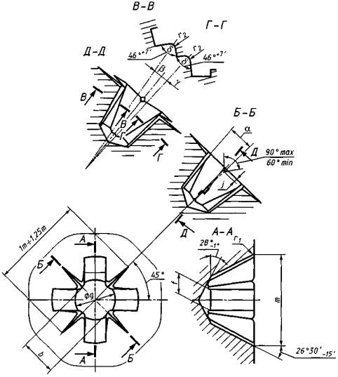 Примечание. Для шлица с номером 0 вместо угла α должно быть скругление радиусом не менее 0,25 и не более 0,36 мм. 1.2. Размеры крестообразных шлицев типа Z должны соответствовать указанным на черт. 2 и в табл. 2.