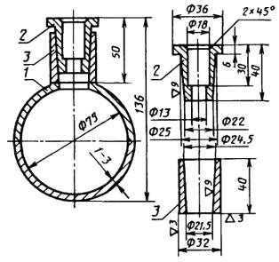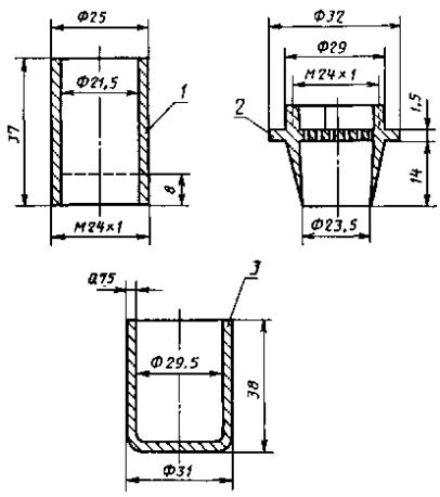 где т1 - масса часового стекла с остатком, г; m2 - масса часового стекла, г; т - масса навески продукта, г. Результат вычисляют с точностью до первого десятичного знака. За результат анализа принимают среднеарифметическое результатов двух параллельных определений, допускаемые расхождения между которыми (предел повторяемости) при доверительной вероятности Р = 0,95 не превышают 1 % абс. Допускаемые расхождения между результатами анализов одной и той же пробы, полученными в разных лабораториях (предел воспроизводимости) при той же доверительной вероятности, не должны превышать 3 % абс. Результат округляют до целого числа. (Измененная редакция, Изм. № 4). 3.4.2. Метод центрифугирования 3.4.2.1. Аппаратура Центрифуга, обеспечивающая фактор разделения 4000+500 Патрон, показанный на черт. 4, или другой конструкции (площадь фильтрующей части постоянна). Секундомер или часы. Бумага фильтровальная. (Измененная редакция, Изм. № 1, 3). 3.4.2.2. Подготовка к анализу Готовят одновременно два патрона. Для этого берут чистый сухой патрон и на дно его верхней части кладут кружок фильтровальной бумаги диаметром 25 мм. Взвешивают весь патрон и отдельно его верхнюю часть. Результат взвешивания в граммах записывают с точностью до третьего десятичного знака. Патрон из латуни или дюраля для определения сырого антрацена 1 - верхняя часть патрона; 2 - опора фильтра; 3 - нижняя часть патрона Черт. 4 3.4.2.3. Проведение анализа Пробу выдерживают не менее 1 ч при комнатной температуре, после чего тщательно перемешивают и отбирают от нее 2 навески массой по 3 - 5 г каждая. Навески помещают в верхние части собранных патронов. Каждый патрон с навеской взвешивают. Массы патронов с навесками должны отличаться не более чем на 0,5 г. После этого оба патрона помещают в расположенные друг против друга гнезда центрифуги и их содержимое центрифугируют 30 мин при факторе разделения 4000+500. Затем патроны извлекают из гнезд центрифуги, отделяют верхние части, обтирают их снаружи фильтровальной бумагой и взвешивают. Результаты всех взвешиваний в граммах записывают с точностью до третьего десятичного знака. 3.4.2.4. Обработка результатов Массовую долю сырого антрацена (X2) процентах вычисляют по формуле