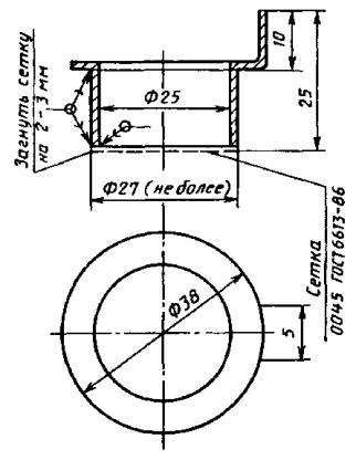 Результат округляют до четвертого десятичного знака. (Измененная редакция, Изм. № 3, Изм. № 4). 3.9. Определение массовой доли механических примесей Метод позволяет определять массовую долю механических примесей от 0,01 до 0,03 % и заключается в определении массовой доли остатка, не проходящего через сетку с отверстиями 45 мкм. 3.9.1. Реактивы, приборы и посуда Толуол каменноугольный по ГОСТ 9880 или толуол нефтяной по ГОСТ 14710. Шкаф сушильный с терморегулятором, обеспечивающий температуру (120 ± 5) °С. Эксикатор по ГОСТ 25336 с хлористым кальцием. Фильтр-сетка (черт. 5) или фильтр любой другой конструкции с сеткой той же площади. Плитка электрическая с закрытой спиралью. Баня водяная. Колба Кн по ГОСТ 25336 вместимостью 250 см3. Стаканы по ГОСТ 25336 вместимостью 100 см3. Промывалка. Фильтр-сетка с корпусом из листа латуни или нержавеющей стали толщиной 0,5 - 0,7 мм Черт. 5 Кружка фарфоровая по ГОСТ 9147 вместимостью 500 см3. Палочка стеклянная длиной 150 - 200 мм с оплавленными концами. Термометры ртутные стеклянные лабораторные с пределами измерения 150 и 100 °С и ценой деления 1 °С. (Измененная редакция, Изм. № 1, 3). 3.9.2. Подготовка к анализу Пробу продукта массой около 300 г в фарфоровой кружке предварительно нагревают в сушильном шкафу или на закрытой электрической плитке до полного растворения кристаллов и тщательно перемешивают. Толуол нагревают на водяной бане до (75 ± 5) °С в промывалке. Фильтр-сетку очищают от механических примесей встряхиванием, промывают из промывалки горячим толуолом, сушат 15 - 20 мин в сушильном шкафу при температуре (120 ± 5) °С и охлаждают в эксикаторе. Взвешивают на весах с пределом взвешивания 200 г. Результат взвешивания в граммах записывают с точностью до четвертого десятичного знака. Фильтр устанавливают на колбу вместимостью 250 см3, предварительно взвешенную на весах типа с пределом взвешивания 500 и 1000 г. Результат взвешивания в граммах записывают с точностью до второго десятичного знака. Колбу с установленным на нее фильтром помещают в сушильный шкаф, нагретый до (120 ± 5) °С, и выдерживают в шкафу не менее 15 мин. (Измененная редакция, Изм. № 1, Изм. № 4). 3.9.3. Проведение анализа Колбу с фильтром извлекают из сушильного шкафа и быстро наливают в нее из кружки через фильтр около 100 см3 продукта, стараясь не попадать на края фильтра. Фильтр устанавливают на другую колбу и промывают горячим толуолом из промывалки, сушат в течение 15 - 20 мин в сушильном шкафу при температуре (120 ± 5) °С, охлаждают в эксикаторе и взвешивают на весах с пределом взвешивания 200 г. Результат взвешивания в граммах записывают с точностью до четвертого десятичного знака. Колбу с фильтратом пробы охлаждают и взвешивают на весах с пределом взвешивания 500 и 1000 г. Результат взвешивания в граммах записывают с точностью до второго десятичного знака. (Измененная редакция, Изм. № 4). 3.9.4. Обработка результатов Массовую долю механических примесей (Х6) в процентах вычисляют по формуле
