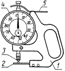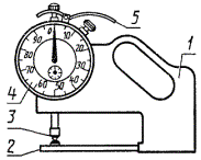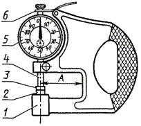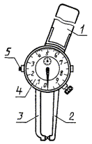Дата введения 01.01.90 Настоящий стандарт распространяется на индикаторные толщиномеры и стенкомеры с верхним пределом измерения до 50 мм, оснащенные отсчетным устройством с ценой деления 0,01 и 0,1 мм (далее - толщиномеры и стенкомеры), и устанавливает обязательные требования к ним в части пп. 1.1, 1.2, 2.2, 2.4, 2.6 и 2.9. (Измененная редакция, Изм. № 1). 1. ОСНОВНЫЕ ПАРАМЕТРЫ И РАЗМЕРЫ1.1. Толщиномеры и стенкомеры должны изготовлять следующих типов: ТН-10, ТН-25 (черт. 1) - настольные толщиномеры с нормированным измерительным усилием; ТР-10, ТР-25 (черт. 2) - ручные толщиномеры с нормированным измерительным усилием; ТР-25Б, ТР-50Б (черт. 3) - ручные толщиномеры без нормированного измерительного усилия; С-2, С-10А (черт. 4) - стенкомеры с ценой деления 0,01 мм отсчетного устройства; С-10Б (черт. 5); С-25, С-50 (черт. 6) - стенкомеры с ценой деления 0,1 мм отсчетного устройства. 1 - корпус; 2 - пятка; 3 - измерительный наконечник; 4 - измерительный стержень; 5 - отсчетное устройство; 6 - арретир; А - вылет Черт. 1 1 - корпус; 2 - пятка; 3 - измерительный наконечник; 4 - измерительный стержень; 5 - отсчетное устройство; 6 - арретир; А - вылет Черт. 2 1 - корпус; 2 - пятка; 3 - измерительный наконечник; 4 - отсчетное устройство; 5 - измерительный стержень; А - вылет Черт. 3 1 - корпус; 2 - неподвижный стержень; 3 - измерительный наконечник; 4 - отсчетное устройство; 5 - арретир Черт. 4 1 - ручка; 2 - неподвижный стержень; 3 - измерительный наконечник; 4 - отсчетное устройство; 5 - арретир Черт. 5 1 - корпус; 2 - неподвижный стержень; 3 - измерительный наконечник; 4 - отсчетное устройство; 5 - арретир Черт. 6 Примечание. Черт. 1-6 не определяют конструкцию. 1.2. Типы, основные параметры и размеры толщиномеров и стенкомеров должны соответствовать указанным на черт. 1-6 и в табл. 1, 2. 1.3. Примеры условных обозначений: - настольного толщиномера с диапазоном измерения 0 - 10 мм, с вылетом А = 60 мм, с нормированным измерительным усилием и не оснащенного твердым сплавом: Толщиномер ТР 10-60 ГОСТ 11358-89 - ручного толщиномера с диапазоном измерения 0 - 25 мм, с вылетом А = 60 мм, с нормированным измерительным усилием и оснащенного твердым сплавом: Толщиномер ТР 25-60Т ГОСТ 11358-89 - то же, без нормированного измерительного усилия и оснащенного твердым сплавом: Толщиномер ТР 25-60БТ ГОСТ 11358-89 - стенкомера типа С-2 с диапазоном измерения 0 - 2 мм: Стенкомер С-2 ГОСТ 11358-89 Таблица 1 В миллиметрах