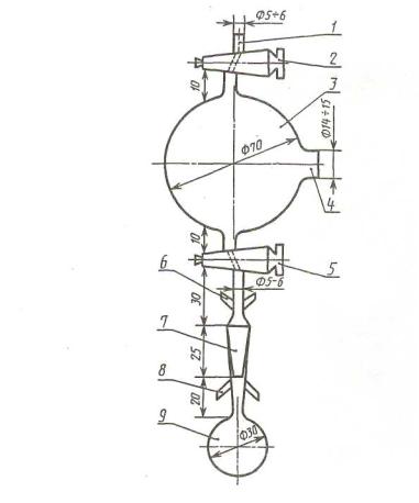 где Kср - среднее арифметическое значение коэффициента пропорциональности; m1 - масса навески латекса, г. Результаты вычислений округляют до третьего десятичного знака. Два результата испытаний, полученные последовательно одним исполнителем на частях одной и той же пробы (отгонок), считают достоверными (с доверительной вероятностью 0,95), если расхождение между ними не превышает 0,015 %. (Измененная редакция, Изм. № 1). 3.8. Определение массовой доли легколетучих углеводородов С2-С4 3.8.1. Аппаратура, посуда, реактивы и материалы Хроматограф с пламенно-ионизационным детектором. Колонка длиной 2м, диаметром 3-4 мм, заполненная наполнителем - 15% (по массе) полиэтиленгликольадипината на твердом носителе типа ТНД-ТС-М (сферохром, целит, хроматон). Прибор для выделения и улавливания легколетучих углеводородов из латекса (черт. 2), выполненный из толстостенного стекла для работы под вакуумом (прибор должен быть герметичным). Вакуум-насос. Весы лабораторные общего назначения 2-го класса по ГОСТ 24104-88 с наибольшим пределом взвешивания 200 г. Лупа измерительная по ГОСТ 25706-83 или другие оптические приборы с ценой деления 0,1мм. Шприц медицинский вместимостью 1см3. Секундомер по нормативной документации. Колба П-2-25-14 ТХС по ГОСТ 25336-82. Колба П-2-1000-29 ТХС по ГОСТ 25336-82 (с горлом, переделанным для самозатягивающейся пробки) или колба П-1-1000 по ГОСТ 25336-82. Очищенные и осушенные газы: азот по ГОСТ 9293-74; бутадиен по нормативной документации; водород по ГОСТ 3022-80; воздух сжатый по нормативной документации. (Измененная редакция, Изм. № 1). 3.8.2. Подготовка к испытанию 3.8.2.1. Режим хроматографа Температура колонки 120°С. Прибор для выделения и улавливания легколетучих углеводородов из латекса