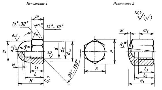 Постановлением Государственного комитета СССР по стандартам от 26 ноября 1985 г. № 3711 дата введения установлена 01.01.87 Издание 2006 г. с Изменением № 1, утвержденным в июле 1992 г. (ИУС 9-92). 1. Настоящий стандарт распространяется на колпачковые гайки класса точности А с диаметром резьбы от 3 до 24 мм. Требования настоящего стандарта являются обязательными. 2. Конструкция и размеры гаек исполнения 1 должны соответствовать указанным на чертеже и в табл. 1, гаек исполнения 2 - указанным на чертеже и в табл. 2.