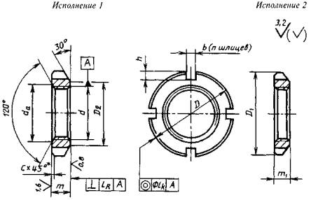 Примечания: 1. Допускается по соглашению между изготовителем и потребителем изготовлять гайки М45 - М125 с 4 шлицами. 2. Гайки с размерами, указанными в скобках, применять не рекомендуется. Пример условного обозначения гайки исполнения 1, с диаметрами резьбы d = 16 мм, с мелким шагом резьбы 1,5 мм с полем допуска резьбы 6Н, из стали марки 35, с химическим окисным покрытием, пропитанным маслом: Гайка М16×1,5 - 6Н.05.05 ГОСТ 11871-88 То же, из латуни Л63, без покрытия: Гайка М16×1,5 - 6Н.32 ГОСТ 11871-88 То же, исполнения 2, с цинковым покрытием толщиной 9 мкм, хроматированным: Гайка 2 М16×1,5 - 6Н.019 ГОСТ 11871-88 1.3. Теоретическая масса стальных гаек указана в приложении 1. 2. ТЕХНИЧЕСКИЕ ТРЕБОВАНИЯ2.1. Поле допуска резьбы - 6Н по ГОСТ 16093. 2.2. Поля допусков размеров и допуски расположения поверхностей должны соответствовать указанным в табл. 2. Допуски углов Допускается по соглашению между изготовителем и потребителем изготовлять гайки с допуском перпендикулярности опорной поверхности к оси резьбы LR - по 11-й степени точности и шероховатостью поверхностей Ra: 1,6; 3,2; 6,3 вместо Ra: 0,8; 1,6; 3,2 - соответственно.