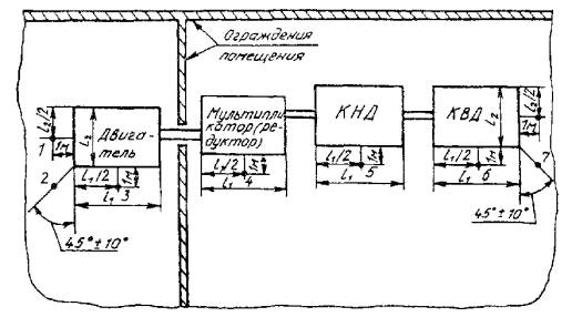 Дата введения 01.07.92 Настоящий стандарт распространяется на все виды стационарных компрессорных агрегатов, компрессорных установок и отдельные их системы (далее - КА и КУ), имеющие максимальный габаритный размер до 15 м. Стандарт устанавливает ориентировочный метод определения шумовых характеристик. Стандарт не распространяется на специальные компрессорные агрегаты и установки (транспортные, холодильные, криогенные и др., изготавливаемые по особым требованиям). 1. ОБЩИЕ ПОЛОЖЕНИЯ1.1. Перечень шумовых характеристик КА (КУ) - по ГОСТ 12.2.016.1. уровни звука в контрольных точках; уровни звукового давления в октавных (третьоктавных) полосах частот в контрольных точках; общие уровни звукового давления в контрольных точках. 1.3. Измерения уровней звукового давления КА (КУ) должны быть проведены в октавных полосах частот со среднегеометрическими частотами от 31,5 до 8000 Гц, а общих уровней звукового давления - по шкале шумомера «Линейная» с 2 Гц. Допускается измерять уровни звукового давления в третьоктавных полосах частот, которые следует пересчитывать в октавные уровни. 2. АППАРАТУРАДля измерения уровней звука и уровней звукового давления КА (КУ) необходимо применять аппаратуру по ГОСТ 12.1.028*. * На территории Российской Федерации действует ГОСТ Р 51402-99 (здесь и далее). 3. УСЛОВИЯ ИЗМЕРЕНИЯ3.1. Условия измерения уровней звука и уровней звукового давления КА (КУ) должны соответствовать ГОСТ 12.1.028, в противном случае уровни звуковой мощности допускается не определять (см. п. 1.2). 3.2. При измерении на открытой площадке недопустимо присутствие объектов крупных размеров в пределах 10 м от любой поверхности КА (КУ) и источников постороннего шума. Если это условие невозможно выполнить, то объекты крупных размеров и источники постороннего шума должны быть приведены на схеме расположения КА (КУ) и точек измерения (см. черт. 1). 1 - 7 - точки измерения шума; КНД - корпус низкого давления компрессора; КВД - корпус высокого давления компрессора; l1 и l2 - длина и ширина огибающего источник шума параллелепипеда Черт. 1 3.3. Испытания КА (КУ) необходимо проводить на установившемся номинальном (расчетном) режиме работы (при номинальных значениях следующих параметров: частоты вращения коленчатого вала или ротора, производительности, начального и конечного давления, начальной и конечной температуры). На предприятиях, эксплуатирующих КА (КУ), допускается проводить шумовые испытания на характерном режиме его работы. Перед испытаниями КА (КУ) должен быть прогрет. Если показания контрольно-измерительных приборов стабильны (их колебания не должны превышать допустимых техническими документами величин), то режим работы КА (КУ) можно считать установившимся. 4. ПОДГОТОВКА К ИЗМЕРЕНИЯМ4.1. Испытываемый КА (КУ) следует установить в середине испытательной площадки на звукоотражающей плоскости. Крепление КА (КУ) к фундаменту должно соответствовать требованиям технической документации. 4.2. Если при проведении испытаний КА (КУ) присутствуют посторонние источники шума (отдельно установленные системы охлаждения, всасывания и выпуска воздуха или газов, регулирующая арматура и т.д.), то организации, проводящей испытания, необходимо принять все возможные меры по изоляции этих источников шума и в протоколе определения шумовых характеристик КА (КУ) описать условия испытаний (см. приложение). 4.3