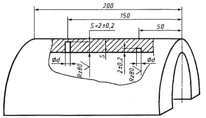 ПРИЛОЖЕНИЕ 3Рекомендуемое МЕТОД КОНТРОЛЯ ПРЕСС-УТЯЖИН1. Общие требования к проведению контроля 1.1. Метод предназначен для обнаружения и определения места окончания пресс-утяжин в прессованных трубах из цветных металлов и сплавов диаметром от 20 мм и толщиной стенки не менее 5 мм с помощью ультразвуковых средств дефектоскопии при контактном способе ввода ультразвуковых колебаний со стороны цилиндрической поверхности изделия. Допускается применять любой ультразвуковой дефектоскоп с соответствующими датчиками, обеспечивающими достаточную чувствительность, которую устанавливают настройкой по испытательному образцу. При контроле предусматривается использование устройств для сканирования с вмонтированными раздельно совмещенными датчиками, а также прямыми совмещенными датчиками ультразвуковых колебаний. Устройство для сканирования позволяет обеспечить стабильный акустический контакт пьезопреобразователя датчика с изделием в динамике за счет непрерывной подачи жидкости под датчик. 2. Испытательные образцы для настройки чувствительности дефектоскопа 2.1. Для настройки и поверки чувствительности дефектоскопа используют испытательные образцы длиной 200 мм с искусственными дефектами (контрольными отражателями). Испытательные образцы с контрольными отражателями изготовляют в соответствии с чертежом на сверлильном станке. Дно контрольного отражателя должно быть плоским. Примечание. На испытательных образцах с толщиной стенки 5 мм изготовляют один контрольный отражатель глубиной, равной половине толщины стенки трубы. 2.2. Амплитуда эхо-сигнала от контрольных отражателей или от пресс-утяжины при максимальном расстоянии между поверхностью ввода и контрольным отражателем должна превышать амплитуду эхо-сигнала от помех не менее чем в три раза. 2.3. При контроле труб с толщиной стенки от 5 до 60 мм необходимо иметь набор испытательных образцов следующих толщин: (5 ± 0,5); (10 ± 1); (15 ± 1,4); (22 ± 2); (30 ± 2,4); (40 ± 3,2); (50 ± 4) мм. Для настройки используют стандартные образцы, наиболее близко соответствующие по толщине подлежащим контролю трубам. 2.4. Поверхность испытательных образцов не должна иметь выбоин, раковин и задиров. 2.5. Для приготовления испытательных образцов отбирают отрезки труб с небольшим затуханием ультразвука. 2.6. Затухание ультразвука определяют по наличию донного эхо-сигнала. 2.7. Отрезок трубы считается годным для испытательного образца, если при оптимальной настройке на экране дефектоскопа наблюдаются донные импульсы в количестве не менее: для труб с толщиной стенки 5 - 6 мм - 5 шт., 6 - 10 мм - 4 шт., 10 - 25 мм - 3 шт., 25 - 50 мм - 2 шт., 50 - 60 мм - 1 шт. 2.8. Испытательные образцы считают действительными, если на фоне помех четко выявляется контрольный отражатель (срабатывает система автоматического сигнализатора дефектов, загорается сигнальная лампочка). 2.9. Испытательные образцы хранят в местах, исключающих их механическое повреждение и коррозию. Срок службы испытательного образца не устанавливается.
