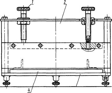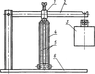 где m - масса клея до сушки, г; m1 - масса клея после сушки, г. За результат испытания принимают среднее арифметическое результатов двух параллельных определений, абсолютное расхождение между которыми не превышает допускаемое расхождение, равное 0,5 %. Допускаемая абсолютная суммарная погрешность результата испытания ± 0,3 % при доверительной вероятности 0,95. (Измененная редакция, Изм. № 2, 3). 3.5. Определение предела прочности клеевого соединения при сдвиге 3.5.1. Аппаратура, приборы, материалы и реактивы: кассета (черт. 1); сушильный шкаф, обеспечивающий температуру до 200 °С с погрешностью не более 5 °С; психрометр бытового назначения; чашка кристаллизационная по ГОСТ 25336; шкурка шлифовальная на тканевой основе по ГОСТ 5009 зернистостью 16 или 20 и 63 или 80; сталь углеродистая качественная конструкционная марки 25 по ГОСТ 1050; листы конструкционные из алюминиевых сплавов Д16АТ по ГОСТ 21631; натрий двухромовокислый по ГОСТ 4237; кислота серная техническая по ГОСТ 2184, концентрированная; бензин по ГОСТ 1012; ацетон технический по ГОСТ 2768, или атилацетат технический по ГОСТ 8981, или спирт этиловый технический по ГОСТ 17299; вода дистиллированная по ГОСТ 6709. 1 - движок; 2 - рычаг; 3 - груз; 4 - кассета; 5 - образцы; 6 - основание Черт. 1 (Измененная редакция, Изм. № 3). 3.5.2. Подготовка к испытанию Для испытания клея марок БФ-2, БФ-4 применяют образцы из алюминиевого сплава, а марки БФ-2Н - из стали. По форме и размерам образцы должны соответствовать ГОСТ 14759. Кромки образцов должны быть ровными без заусенец. Поверхность образцов перед испытанием подготавливают механическим или химическим методом. При возникших разногласиях подготовку поверхности образцов производят химическим методом. При механическом методе поверхность образцов из алюминиевого сплава зачищают шлифовальной шкуркой зернистостью 16 или 20, а из стали - зернистостью 63 или 80. Образцы, на поверхности которых обнаружены дефекты, подвергают дополнительной обработке. После обработки образцы протирают тампоном, смоченным бензином или ацетоном, с последующей сушкой при 15 - 35 °С в течение 10 - 15 мин, затем тампоном, смоченным ацетоном, этилацетатом или этиловым спиртом с последующей сушкой при той же температуре в течение 5 мин. При химическом методе поверхность образцов обрабатывают так же, как после механической обработки. Затем образцы погружают на 10 мин в ванну с составом, рецептура которого указана в табл. 2. Температура состава 60 - 70 °С для образцов по стали и 80 - 100 °С - из алюминиевого сплава. Таблица 2