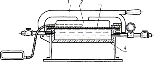 Образцы, извлеченные из ванны, промывают проточной водой, затем дистиллированной и удаляют влагу с их поверхности фильтровальной бумагой. После этого образцы выдерживают в сушильном шкафу 30 мин при 70 - 100 °С и охлаждают на воздухе до комнатной температуры. Для склеивания образцов на подготовленную поверхность наносят слой клея кисточкой или стеклянной палочкой при относительной влажности окружающей среды не выше 70 %. Образцы, покрытые одним слоем клея марок БФ-2, БФ-4, БФ-2Н, выдерживают на воздухе «до отлипа» в течение 30 - 60 мин, затем в сушильном шкафу при 55 - 60 °С в течение 15 мин и охлаждают на воздухе до комнатной температуры. Затем образцы вторично покрывают слоем клея, выдерживают на воздухе «до отлипа» в течение 30 - 60 мин, в сушильном шкафу при 55 - 60 °С - 15 мин, после этого в течение 10 - 20 мин температуру в сушильном шкафу повышают до 85 - 90 °С, не вынимая образцов, и при этой температуре выдерживают их 50 - 60 мин. После извлечения из сушильного шкафа и охлаждения до комнатной температуры образцы склеивают, помещая в специальную кассету. Кассету зажимают в рычажном прессе, причем плечо и груз подбирают так, чтобы удельное давление на поверхность склейки составляло 5 - 6 кгс/см2. Приспособление вместе с образцами и грузом помещают в сушильный шкаф, снабженный термопарой и терморегулятором, спай термопары должен быть подведен к клеевому шву образцов. Сушильный шкаф нагревают до 150 ± 5 °С и выдерживают образцы в нем в течение 1 ч. После чего обогрев выключают и охлаждают образцы в сушильном шкафу до 50 - 40 °С. Затем приспособление с образцами вынимают из сушильного шкафа, кассету освобождают от груза и образцы вынимают. Расход клея при двукратном нанесении должен составлять 60 - 80 г (в пересчете на сухое вещество) на 1 м2 склеиваемой поверхности. Перед испытанием склеенные образцы выдерживают при комнатной температуре не менее 16 ч. (Измененная редакция, Изм. № 2, 3). 3.5.3. Проведение испытания Предел прочности клеевого соединения при сдвиге определяют по ГОСТ 14759. Испытание образцов при 60, 80, 150, 200 °С проводят в камере, предварительно нагретой до необходимой температуры. Время прогрева образцов перед испытанием 30 - 35 мин. Одновременно в камеру загружают не более пяти образцов. За результат испытания принимают среднее арифметическое результатов пяти определений, расхождение между наибольшим и наименьшим значениями которых не должно превышать допускаемого расхождения для клея БФ-2 при температуре 20 °С - 2,3 МПа (24 кгс/см2), при температуре 80 °С - 2,0 МПа (21 кгс/см2), для клея БФ-4 при температуре 20 °С - 2,6 МПа (27 кгс/см2), при температуре 60 °С - 2,5 МПа (26 кгс/см2). Допускаемая абсолютная суммарная погрешность результата испытания для клея БФ-2 при температуре 20 °С составляет ± 0,7 МПа (7 кгс/см2), при температуре 80 °С - ± 0,5 МПа (5 кгс/см2), для клея БФ-4 при температуре 20 °С составляет ± 0,7 МПа (7 кгс/см2), при температуре 60 °С - ± 0,6 МПа (6 кгс/см2) при доверительной вероятности 0,95. (Измененная редакция, Изм. № 3). 3.6. Определение сопротивления расслаиванию 3.6.1. Аппаратура и материалы: разрывная машина, обеспечивающая измерение нагрузки от 10 до 90 % номинального значения шкалы. Отсчетный механизм машины должен быть отрегулирован так, чтобы можно было регистрировать нагрузку в момент проведения испытания. Скорость движения нижнего захвата машины должна быть 100 мм/мин; ракля (черт. 2); гидропре