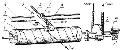 4.3. За результат испытания принимают среднее арифметическое не менее трех значений показателей, отличающихся от среднего не более чем на 10 %. Если результаты испытания отличаются от среднего значения более чем на 10 % и после обработки осталось менее трех показателей, испытание повторяют и рассчитывают среднее значение по всем показателям. 4.4. Результаты испытания записывают в протокол, содержащий следующие данные: дату испытания; способ изготовления образцов; шифр резины и условия вулканизации; температуру испытания; истирающую способность шлифовальной шкурки (ag); истирающую способность шлифовальной шкурки при разогретом барабане (ag΄); силу трения; относительное проскальзывание; нормальную силу; массу образца для испытания; массу образца после испытания; плотность резины; показатели, характеризующие сопротивление резины истиранию и их среднее значение. (Измененная редакция, Изм. № 1). ПРИЛОЖЕНИЕСправочное СХЕМА И ОПИСАНИЕ ОДНОГО