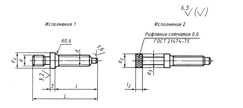 Пример условного обозначения винта исполнения 1, размерами d = M6, l = 25 мм: Винт 7006-0121/001 ГОСТ 12463-67 (Введен дополнительно, Изм. № 2). 2. Материал винта (деталь 1) и рукоятки исполнения 1 (деталь 2) - сталь марки 45 по ГОСТ 1050-88. Допускается замена на стали других марок с механическими свойствами не ниже, чем у стали марки 45. Материал рукоятки винта исполнения 2 (деталь 2) - фенопласт марок У1-301-07 или У2-301-07 коричневого цвета. Допускается по требованию заказчика изготовлять рукоятки другого цвета. 3. Твердость нажимного конца винта (деталь 1) - 35,0 ...39,5 HRCэ. 4. Неуказанные предельные
