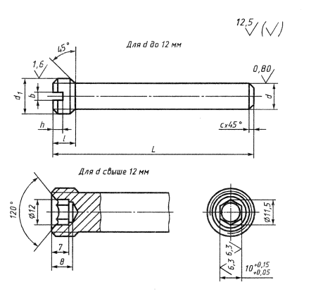 Пример условного обозначения потайной оси размерами d = 4мм, L = 20мм, с полем допуска диаметра d - f9: Ось 7018-0281 f9 ГОСТ 12469-67 То же, с полем допуска диаметра d - h6: Ось 7018-0281 h6 ГОСТ 12469-67 (Измененная редакция, Изм. № 1, 2). 2. Материал - сталь марки 45 по ГОСТ 1050-88. Допускается замена на стали других марок с механическими свойствами не ниже, чем у стали марки 45. 3. Твердость - 35,0 . . . 39,5 HRCэ. 4. Неуказанные предельные