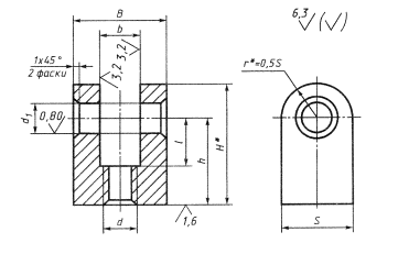 *В случае применения штифтов типа 1 по ГОСТ 3128-70-поле допуска отверстия d1 - К7. Соответственно в условном обозначении указывать поле допуска К7. Пример условного обозначения вилки с резьбовым отверстием размерами d-M6, b=8мм, с полем допуска диаметра d1 - Н7: Вилка 7018-0371 Н7ГОСТ12470-67 (Измененная редакция, Изм. № 1, 2). 2. Материал - сталь марки 45 по ГОСТ 1050-88. Допускается замена на стали других марок с механическими свойствами не ниже, чем у стали марки 45. 3. Твердость - 35,0…39,5 HRCэ. 4. Неуказанные предельные