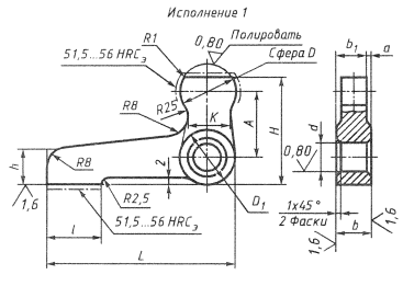* В случае применения штифтов типа 1 по ГОСТ 3128-70 - поле допуска отверстия d - К7. Соответственно в условном обозначении указывать поле допуска К7. Пример условного обозначения углового рычага исполнения 1, размерами А = 20мм, L = 55мм, с полем допуска диаметра d - Н7: Рычаг 7018-0391 Н7 ГОСТ 12471-67(Измененная редакция, Изм. № 1, 2). 2. Материал - сталь марки 40Х по ГОСТ 4543-71. Допускается замена на стали других марок с механическими свойствами не ниже, чем у стали марки 40Х. 3. Угловые рычаги исполнения 1 изготавливать методом прецизионного литья. 4. Литейные радиусы - 3 мм. 5. Твердость - 36,5 ... 41,5 HRCэ, кроме мест, обозначенных особо. (Измененная редакция, Изм. № 1, 2). 6. Неуказанные предельные