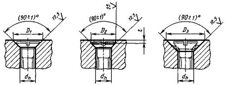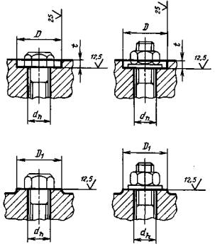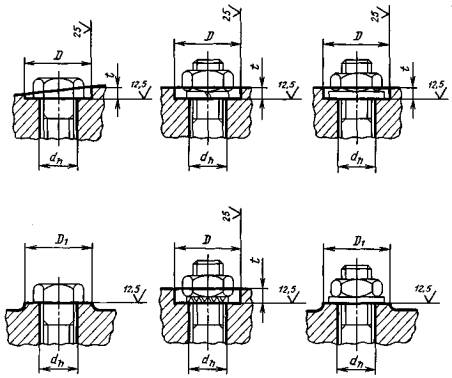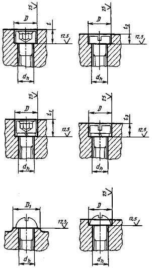 Примечание. Размеры t1 и t3 даны для винтов с нормальными или легкими пружинными шайбами по ГОСТ 6402-70. 2г. Размеры опорных поверхностей под потайные и полупотайные головки винтов и шурупов и под шайбы стопорные с зубьями для винтов с потайной и полупотайной головкой должны соответствовать указанным на черт. 5 и в табл. 5.