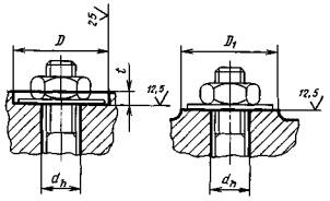 2а, 2б, 2в, 2г, 2д. (Введены дополнительно, Изм, № 4). 3. Обработка опорных поверхностей по черт. 1 - 3 производится в технически обоснованных случаях. Размер t устанавливается конструктором. При глубине t, превышающей 1/3 высоты головки болта (гайки), размеры D следует брать по ГОСТ 13682-80. 4. Между опорной и цилиндрической поверхностями допускается радиус закругления не более 0,3 мм. У опорных поверхностей под шестигранные головки болтов без шайб и под цилиндрические и полукруглые головки винтов без шайб между опорной плоскостью и сквозным отверстием должна быть фаска 0,5×45° для крепежных деталей диаметром резьбы от 12 до 20 мм и 1×45° - для деталей диаметром резьбы свыше 20 мм. 3,4. (Измененная редакция, Изм. № 4). 5. (Исключен, Изм. № 4). 6. Диаметры сквозных отверстий dh - по ГОСТ 11284-75. Для опорных поверхностей под цилиндрические головки винтов сквозные отверстия по 3-му ряду ГОСТ 11284-75 не рекомендуются. (Измененная редакция, Изм. № 4). 7. (Исключен, Изм. № 4). 8. Для опорных поверхностей по черт. 4 при проектировании соединения допускается увеличивать размеры t, t1, t2, t3. В случае применения 1-го ряда сквозных отверстий по ГОСТ 11284-75 для уменьшения зазора между головкой винта и цилиндрической поверхностью диаметром D допускается уменьшать диаметр D. (Измененная редакция, Изм. № 4). 9. (Исключен, Изм. № 4). |