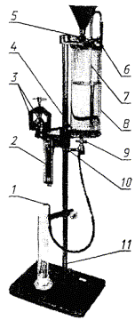 Дата введения 01.07.78 Настоящий стандарт распространяется на бумагу и картон и устанавливает метод определения воздухопроницаемости. Стандарт распространяется на бумагу и картон с воздухопроницаемостью от 10-2 до 102 мкм/(Па·с) (от 1 до 6000 см3/мин). Стандарт не распространяется на крепированную бумагу и гофрированный картон. Сущность метода заключается в измерении объема воздуха, прошедшего через определенную площадь образца бумаги или картона за единицу времени при определенном разрежении под образцом. (Измененная редакция, Изм. № 2). 1. ОТБОР ПРОБ1.1. Отбор проб - по ГОСТ 8047. 2. АППАРАТУРА, ПОСУДА И МАТЕРИАЛЫ2.1. Для испытания должны применяться: Прибор типа дензометра Шоппера с верхним пределом измерения 500 см3/мин и более, показанный на чертеже. На штативе 11 помещен цилиндрический сосуд 8, соединенный резиновой трубкой 4 с зажимом для закрепления образца 3. Зажим соединен с мановакуумметром 2. Сосуд плотно перекрыт с обеих сторон металлическими крышками. В верхней крышке имеются отверстия для трубки 7, воздушного крана 6 и воронки, снабженной краном 5. К штативу прикреплена сливная трубка 1, так чтобы ее можно было перемещать вверх и вниз по штативу. Сливная трубка соединена резиновым шлангом с нижней крышкой через патрубок, в котором находится кран 9 и регулировочный вентиль 10. Прибор должен отвечать перечисленным ниже требованиям. Зажимное устройство должно обеспечивать герметичное закрепление образца, испытуемая площадь которого должна составлять 10 см2. Диаметр отверстия кольцевого зажима должен быть (35,70 ± 0,05) мм. Сменный зажим овальной формы применяют для испытания узких полос бумаги шириной не менее 25 мм. Размеры отверстия овального зажима должны быть: длина (69,90 ± 0,05) мм, ширина (15,00 ± 0,05) мм. Мановакуумметр для измерения разрежения должен иметь верхний предел измерения не менее 1 кПа (100 мм вод. ст.).