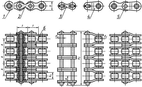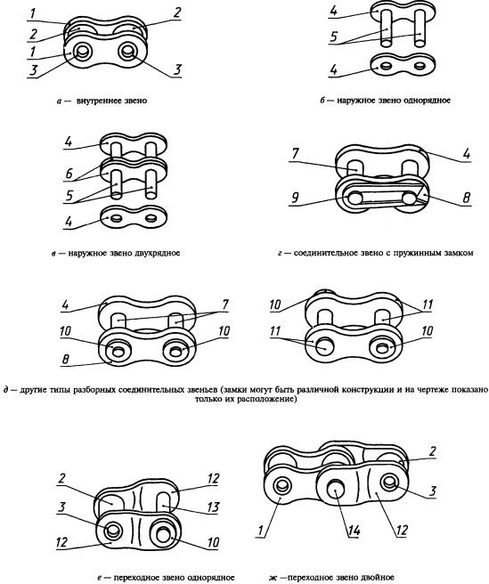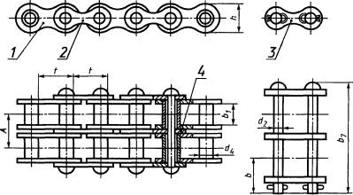 3 Настоящий стандарт представляет собой полный аутентичный текст ИСО 606-94 «Цепи приводные роликовые прецизионные с коротким шагом» и содержит дополнительные требования, отражающие потребности экономики страны 4 Постановлением Государственного комитета Российской Федерации по стандартизации и метрологии от 17 ноября 1999 г. № 407-ст межгосударственный стандарт ГОСТ 13568-97 (ИСО 606-94) введен в действие непосредственно в качестве государственного стандарта Российской Федерации с 1 июля 2000 г. 5 ВЗАМЕН ГОСТ 13568-75 ГОСТ 13568-97 МЕЖГОСУДАРСТВЕННЫЙ СТАНДАРТ ЦЕПИ ПРИВОДНЫЕ РОЛИКОВЫЕ И ВТУЛОЧНЫЕ Общие технические условия Driving roller and bush chains. General specifications Дата введения 2000-07-01 1 Область примененияНастоящий стандарт распространяется на приводные роликовые и втулочные одно- и многорядные цепи, предназначенные для силовых механических передач разнообразных машин и механизмов, кроме буровых установок. Требования стандарта являются обязательными. 2 Нормативные ссылкиВ настоящем стандарте использованы ссылки на следующие стандарты: ГОСТ 8.051-81 Государственная система обеспечения единства измерений. Погрешности, допускаемые при измерении линейных размеров до 500 мм ГОСТ 9.014-78 Единая система защиты от коррозии и старения материалов изделий. Временная противокоррозийная защита изделий. Общие требования ГОСТ 591-69 Звездочки к приводным роликовым и втулочным цепям. Методы расчета и построения профиля зуба и инструмента. Допуски ГОСТ 592-81 Звездочки для пластинчатых цепей. Методы расчета и построения профиля зубьев. Предельные отклонения ГОСТ 15150-69 Машины, приборы и другие технические изделия. Исполнения для различных климатических районов. Категории, условия эксплуатации, хранения и транспортирования в части воздействия климатических факторов внешней среды 3 Типы, основные параметры и размеры3.1 Настоящий стандарт устанавливает параметры, размеры и требования к приводным цепям следующих типов: ПР - роликовые однорядные; 2ПР - роликовые двухрядные; 3ПР - роликовые трехрядные; 4ПР - роликовые четырехрядные; ПВ - втулочные однорядные; 2ПВ - втулочные двухрядные; ПРИ - роликовые с изогнутыми пластинами. 3.2 Типы, основные параметры и размеры цепей, их соединительные и переходные звенья должны соответствовать указанным на рисунках 1-7 и в таблицах 1, 2, а также на рисунках А.1-А.4, в таблицах А.1, А.2 приложения А и в таблице Б.1 приложения Б.