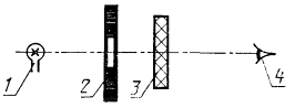 При прессовании используют прокладки из алюминиевой фольги. Пресс-форму с навеской полимера помещают на плиту пресса, нагретую до температуры, указанной в табл. 3, и выдерживают при этой температуре до полного расплавления полимера в течение времени, указанного в табл. 3. После этого создают давление в пресс-форме, указанное в табл. 3. Затем отключают обогрев и выдерживают под давлением при естественном охлаждении до температуры 210 - 220 °С, снимают давление, пресс-форму с пластиной быстро опускают в ванну с проточной водой и распрессовывают вручную. Температуру плит пресса измеряют термоэлектрическим преобразователем. 3.3.5. Перед вырубкой образцов пластину предварительно прогревают в термостате при температуре (100 ± 5) °С в течение (15 ± 3) мин. Из пластин вырубают штанцевыми ножами образцы для физико-механических испытаний и для определения температуры потери прочности. 3.4. Перед проведением физико-механических испытаний образцы кондиционируют по ГОСТ 12423-66 не менее 1 ч на воздухе при температуре (23 ± 2) °С и ненормированной влажности. 3.5. Определение внешнего вида пластины Цвет пластины из фторопласта-3 определяют в отраженном свете сравнением с пластиной-образцом, согласованным с потребителем и утвержденным в установленном порядке. Пластины при испытании помещают на лист белой бумаги. Чистоту пластины сравнивают с образцом, согласованным с потребителем и утвержденным в установленном порядке. Испытание проводят в проходящем свете, создаваемом лампой мощностью 100 Вт или с помощью лампового дефектоскопа. Образец помещают по отношению к источнику света по схеме, указанной на черт. 1. Определение внешнего вида пластины проводят на одной пластине перед вырубкой из нее образцов для физико-механических испытаний. За результат определения принимают оценку соответствия цвета и чистоты пластины, указанным в табл. 1, подпункт 2. 1 - источник света, 2 - непрозрачный экран с отверстием, 3 - образец, 4 - глаз контролера. Черт. 1 3.6. Определение остатка после просева на сите с сеткой № 05К 3.6.1. Аппаратура Весы лабораторные общего назначения 4-го класса точности по ГОСТ 24104-80 с наибольшим пределом взвешивания 500 г. Сито с сеткой № 05К по ГОСТ 6613-86. 3.6.2. Проведение испытания (100 ± 1) г фторопласта-3 и сито взвешивают отдельно и результат взвешивания записывают с точностью до первого десятичного знака. Порошок просеивают через сито, встряхивая и протирая. Затем сито с остатком порошка взвешивают и результат записывают с той же точностью. 3.6.3. Обработка результатов Остаток после просева на сите (X1) в процентах вычисляют по формуле