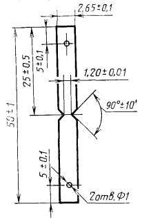 где т - масса стаканчика с таблеткой после прогрева при температуре (110 ± 10) °С, г; m1 - масса стаканчика с таблеткой после прогрева при температуре (270 ± 2) °С, г; m2 - масса пустого стаканчика, г. За результат испытания принимают среднее арифметическое результатов двух параллельных определений, допускаемое расхождение между которыми не должно превышать 0,04 %. 3.9. Определение температуры потери прочности 3.9.1. Аппаратура, материалы Весы лабораторные общего назначения 2-го класса точности по ГОСТ 24104-80 с наибольшим пределом взвешивания 200 г. Микрометр МК 25-1 ГОСТ 6507-78. Шило диаметром 1 мм. Ножницы. Зажимы. Термостат с обогревом до температуры 300 °С, имеющий смотровое стекло и прибор с программным регулированием температуры, обеспечивающий подъем температуры 1,5 - 2,0 °С в минуту. Термометр ТЛ-2 1-А 5 ГОСТ 215-73. Термометр сопротивления ТСП по ГОСТ 6651-84 с диапазоном измерения температуры от минус 200 до плюс 300 °С в комплекте с регулирующим прибором класса точности 0,5. Фольга алюминиевая толщиной 0,1 - 0,2 мм по ГОСТ 618-73. Проволока нихромовая диаметром 0,2 - 0,3 мм по ГОСТ 8803-77. 3.9.2. Проведение испытания Испытания проводят на трех образцах (черт. 2), вырубленных из пластины, изготовленной как указано в п. 3.3.2. На каждом образце делают шилом два отверстия диаметром 1 мм на расстоянии 5 мм от краев образца для подвешивания образца и груза. Массу груза (т) в граммах вычисляют по формуле