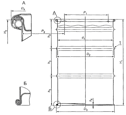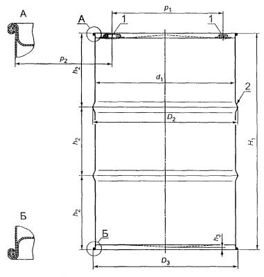 Черт. 2 1 - гофр; d1 - внутренний диаметр; D2 - наружный диаметр по гофрам катания; D3 - наружный диаметр по закатному шву; D4 - наружный диаметр по запорному обручу; H1 - габаритная высота бочки; H2 - высота бочки без верхнего дна; h3 - расстояние между гофрами; p1 - расстояние между центрами горловин; р2 - расстояние от оси заливной горловины до наружной поверхности корпуса, измеренное в 50 мм от верха бочки; h4 - расстояние от нижнего дна бочки до пола, h4 = 4 мм (мин) Глубина верхней крышки должна обеспечивать невыступание заливных горловин выше закатного шва. Таблица 3 Размеры бочки со съемным верхним дном 1А2 вместимостью 208,0 - 216,5 дм3 мм