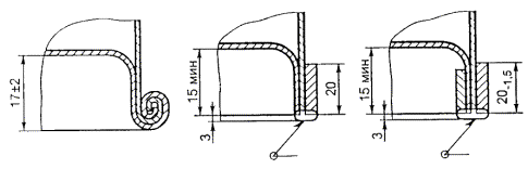 * Размеры бочек являются предпочтительными. Примечания: 1. Для бочек с вогнутым верхним дном габаритная высота H1, может быть увеличена на 4 мм для обеспечения заданной вместимости. 2. Допускается устанавливать одну или две горловины. Осевая линия горловины должна совпадать с осевой линией бочки. Пример условного обозначения стальной сварной бочки типа 1А1 вместимостью 100 дм3: БС 1А1-100 ГОСТ 13950 То же, стальной бочки вместимостью 216,5 дм3: БС IA1-216,5 ГОСТ 13950 То же, стальной закатной бочки типа 1А2 вместимостью 200 дм3: БЗ 1А2-200 ГОСТ 13950 То же, стальной оцинкованной бочки: БЗ 1А2-200 Ц ГОСТ 13950. СОЕДИНЕНИЕ КОРПУСА БОЧКИ С ДНОМ Закатка Сварка для бочек: неоцинкованных оцинкованных
