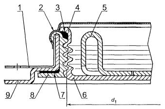 1 - пломбировочное кольцо/защитное кольцо; 2 - колпачок; 3 - уплотнение; 4 - резиновая шайба крышки; 5 - хвостовик для заворачивающего ключа; 6 - стальная крышка; 7 - резиновая прокладка; 8 - фланец горловины; 9 - верхнее дно бочки Черт. 1