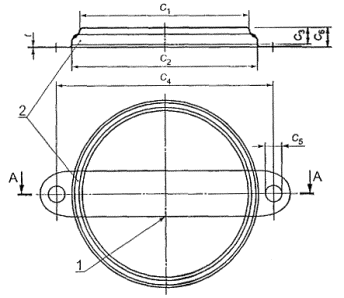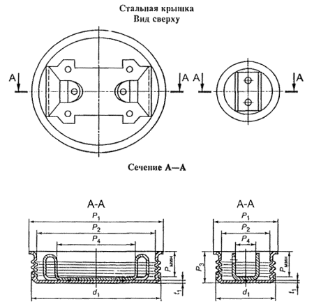 Примечание. Допускается применять пломбировочные и защитные кольца при толщине верхнего дна 0,8 - 2,0 мм. Конфигурацию оговаривают между поставщиком и заказчиком. Стальная крышка и ее прокладка из эластомера или термопласта Стальную крышку и ее прокладку из эластомера или термопласта выполняют в соответствии с черт. 6 - 8 и табл. 3, 4. Черт. 6