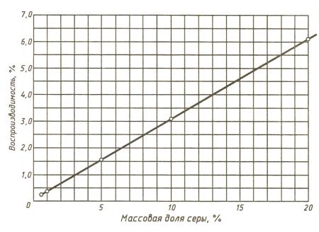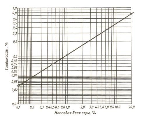 где Х - массовая доля серы в испытуемом нефтепродукте, %; W - массовая доля воды в испытуемом нефтепродукте, определенная по ГОСТ 2477-65, %. (Измененная редакция, Изм. № 1). 4.2. Массовую долю серы в испытуемом нефтепродукте вычисляют как среднее арифметическое двух параллельных определений. 4.3. Результат определения вычисляют до второго десятичного знака и округляют до первого десятичного знака. (Введен дополнительно, Изм. № 1). 5. ТОЧНОСТЬ МЕТОДА5.1. Сходимость метода Два результата определений, полученные одним исполнителем в одной лаборатории, признаются достоверными (с 95 %-ной доверительной вероятностью), если расхождение между ними не превышает значения сходимости для большего результата, указанного на черт. 1. Черт. 1 5.2. Воспроизводимость метода Два результата испытания, полученные в двух разных лабораториях, признаются достоверными (с 95 %-ной доверительной вероятностью), если расхождение между ними не превышает значения воспроизводимости для большего результата, указанного на черт. 2 (диапазон измерений свыше 0,5 %). Черт. 2 |