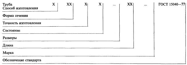 1.5. Трубы длиной, кратной мерной, должны поставляться с припуском на каждый рез по 5 мм и с предельными отклонениями на общую длину в соответствии с п. 1.4. Примеры условных обозначений Условные обозначения проставляются по схеме