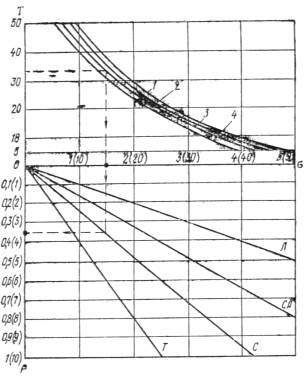 Рис. 2. Номограмма для определения рабочего давления в трубопроводе из ПВП в зависимости от срока службы трубопровода и температуры транспортируемой среды Л, СЛ, С, Т - типы труб; Р - величина допустимого рабочего давления в трубе, МПа (кгс/см2); Т - температура транспортируемой среды, °С; s - величина напряжений в теле трубы, МПа (кгс/см2). Срок службы трубопровода: 1 - 11,4 года; 2 - 15 лет; 3 - 25 лет; 4 - 50 лет.
