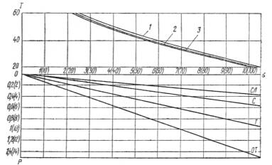 Рис. 4. Номограмма для определения рабочего давления в трубопроводе из ПВХ-100 в зависимости от срока службы трубопровода СЛ, С, Т, ОТ - типы труб; Р - величина допустимого рабочего давления в трубе, МПа (кгс/см2); Т - температура транспортируемой среды, °С; s -величина напряжений в теле трубы, МПа (кгс/см2). Срок службы трубопровода: 1 - 11,4 года; 2 - 30 лет; 3 - 50 лет.