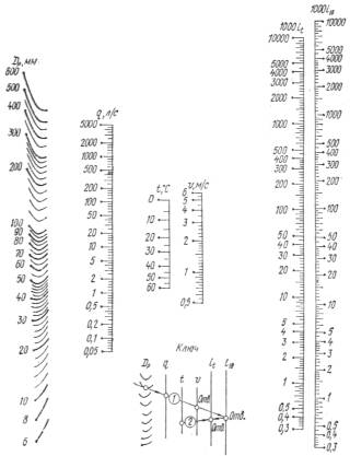 vt — коэффициент кинематической вязкости жидкости при температуре t °С, м2/с. Примечания: 1. При bн £ 1 (ламинарный режим течении) формулы (2) - (4) недействительны; при bн > 2 (квадратичная область гидравлических сопротивлений турбулентного режима течения жидкости) следует принимать bн = 2. 2. Допускается производить гидравлический расчет напорных пластмассовых трубопроводов по номограмме (рис. 5). Правила пользования номограммой следующие. Для решения системы уравнений