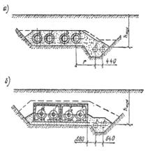 Примечания: 1. При укладке трубопроводов горячего водоснабжения или теплоснабжения в канале (рис. 9) расстояние в свету между наружной поверхностью труб водопровода и стенкой канала надлежит принимать 600 мм. 2. При соответствующем теплотехническом расчете допускается совмещенная прокладка в земле или канале и по другим проектным вариантам. При этом температура на наружной поверхности пластмассового трубопровода в период эксплуатации не должна превышать максимальной температуры транспортируемой среды.