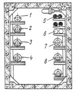 Рис. 10. Схема размещения трубопроводов водоснабжения из пластмассовых труб в туннеле 1 -газопровод; 2 -трубопровод горячего водоснабжения циркуляционный; 3 -трубопровод горячего водоснабжения подающий; 4 -трубопровод холодного водоснабжения из труб ПВХ; 5 -силовой кабель; 6 -телефонные кабели; 7 -трубопровод отопления обратный; 8 -трубопровод отопления подающий 3.3. Для трубопроводов с неразъемными соединениями, прокладываемых в каналах или туннелях, а также наземно или надземно на опорах, линейная компенсация производится с помощью расстановки креплений и специальных компенсирующих деталей, предусмотренных в п.. 4.9-4.11 Примечание. При прокладке пластмассовых трубопроводов в каналах через 18-20м следует устанавливать неподвижные крепления. 3.4. Расстояние между опорами при открытой прокладке горизонтальных пластмассовых труб с неразъемными соединениями, а также при прокладке в каналах или туннелях следует принимать по табл. 7. При прокладке труб с раструбными соединениями на резиновых кольцах расстояния между креплениями принимаются по этой же таблице, если соединения расположены на опорах, а при расположении раструбных соединений между опорами, расстояния, приведенные в таблице, следует уменьшить на 30%. Примечание. Для труб из ПВХ типов Л, СЛ и С расстояния между опорами следует принимать такими же, как для труб из ПВП и ПП соответственно типов СЛ, С и Т. 3.5. Расстояния между креплениями при прокладке вертикальных пластмассовых труб с неразъемными соединениями следует определять по табл. 8.