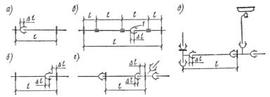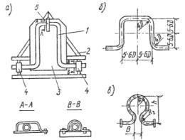 Рис. 15. Варианты расстановки креплений на канализационном трубопроводе а -неподвижное крепление; б -подвижное крепление, в -зазор для компенсации температурных удлинений; г и д -расстояния между креплениями; 1 -компенсационный (удлиненный) раструб крепление, устанавливаемое на гладком конце трубы или фасонной части, должно располагаться от раструба на расстоянии, допускающем температурные удлинения трубопровода; на патрубках, используемых для присоединения к сети унитазов и трапов, а также на отводных трубах от пластмассовых сифонов установку креплений предусматривать не следует; на трубопроводах рекомендуется установка одного разъемного соединения с резиновым уплотнительным кольцом между двумя неподвижными креплениями. При этом удлинение трубопровода не должно превышать компенсирующей способности соединения. 5.12. Расстояние между креплениями на горизонтальных трубопроводах внутренней бытовой канализации и внутренних водостоков должно быть не более 10 D, на вертикальных -20 D, где D -наружный диаметр трубы. 5.13. Трубопроводная арматура и металлические фасонные части, находящиеся на трубопроводе, должны иметь самостоятельное крепление, предотвращающее передачу веса на трубопровод. Усилия, возникающие при пользовании арматурой в процессе ее эксплуатации, не должны передаваться на трубопровод. 5.14. Крепление трубопроводов следует покрывать антикоррозионным покрытием. Б. МОНТАЖ ВОДОПРОВОДНЫХ И КАНАЛИЗАЦИОННЫХ СЕТЕЙ6. Общие указанияХранить пластмассовые трубы и фасонные части в закрытом помещении следует не ближе 1 м от нагревательных приборов. 6.2. Пластмассовые трубы и фасонные части необходимо оберегать от механических нагрузок и ударов. Поверхности пластмассовых труб необходимо оберегать от нанесения царапин. При перевозке пластмассовые трубы необходимо укладывать на ровную поверхность транспортных средств, предохраняя от острых металлических углов и ребер. 6.3. При перевозке труб длиной более 8 м длина свешивающихся с кузова машины или прицепа концов труб не должна превышать 1,5 м. 6.4. Узлы трубопровода надлежит доставлять на объекты строительства, как правило, в контейнерах, в которых детали трубопроводов должны быть закреплены. На контейнерах должна быть надпись «Не бросать». 6.5. Транспортировка, погрузка и разгрузка пластмассовых труб из ПВП, как правило, производится при температуре наружного воздуха не ниже минус 20° С; ПНП минус 30° С, а ПВХ и ПП минус 10° С. Так как трубы из ПВХ и ПП имеют повышенную хрупкость при отрицательных температурах, их транспортирование при температуре до минус 20° С допускается при использовании пакетов или других устройств, обеспечивающих фиксацию труб, а также при принятии особых мер предосторожности. 7. Трубозаготовительные работыОрганизация трубозаготовительных работ 7.1. Изготовление деталей и отдельных узлов трубопроводов должно производиться на заводах монтажных заготовок или трубозаготовительных мастерских с учетом их транспортабельности и сохранности при перевозках, а на монтажной площадке должны осуществляться сборка и сварка (склеивание) трубопроводов из готовых узлов с минимальным числом соединений. 7.2. Сборку элементов узлов следует производить в кондукторах, обеспечивающих фиксацию положения отдельных элементов узлов трубопроводов и облегчающих сборку. 7.3. П