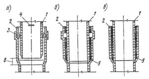 Рис. 12. Соединение труб из ПВХ с резиновыми кольцами (а) и клеевые (б и в) 1 -гладкий конец трубы; 2 -конец трубы с раструбом; 3 -резиновое уплотнительное кольцо; 4 -монтажная метка; 5 -клеевой шов; 6 -зазор для компенсации температурных удлинений 4.12. Компенсация температурных удлинений при использовании сварных и клеевых соединений должна обеспечиваться с помощью соединений с резиновыми уплотнительными кольцами, вставляемыми в обычный или компенсационный (удлиненный) раструб. 4.13. При скрытой прокладке канализационных трубопроводов в местах установки на трубопроводе ревизий и прочисток следует предусматривать смотровые люки с дверцами. 4.14. Вытяжную часть стояка канализации рекомендуется выполнять из пластмассовых труб. 4.15. Следует предусматривать жесткое и прочное крепление санитарных приборов, приемников бытовых сточных вод, а также водосточных воронок к строительным конструкциям. 4.16. Склеивание гладких концов труб из ПВХ (рис. 12) с раструбами, имеющими желобки под резиновые кольца, допускается только при использовании зазорозаполняющих клеев (на поверхность желобка клеи не наносится). Склеивание концов труб с гладкими раструбами следует производить с помощью клеев, заполняющих и не заполняющих зазоры между поверхностями соединяемых элементов, при этом зазоры следует принимать в соответствии с указаниями п. 10.2 настоящей Инструкции.