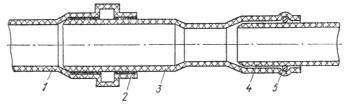Рис. 13. Узел соединений раструбного конца детали из ПВХ с гладким концом полиэтиленовой трубы 1 -раструбный конец с желобком детали из ПВХ; 2 -клеевой шов; 3 -переходной патрубок из ПВХ; 4 -гладкий конец полиэтиленовой трубы; 5 - уплотнительное кольцо из резины марки 3311 4.17. Для соединения гладких концов деталей из ПВП наружными диаметрами 107,5-108,3и 48,6-49,2мм с раструбами труб из ПВХ наружными диаметрами соответственно 110-110,6 и 50-50,4мм следует использовать переходные патрубки, на которых формуется раструб (рис. 13). 4.18. Для соединения гладких концов деталей наружными диаметрами 110-110,6 и 50-50,4мм из ПНП, ПВП, ПП и ПВХ с раструбами деталей из ПВП наружными диаметрами 107,5-108,3 и 48,6-49,2мм следует предусматривать калибровку гладких концов на размеры соответственно 107,5-108,3 и 48,6-49,2мм. Соединение уплотняется резиновыми уплотнительными кольцами. 4.19 Соединение сварных разводок с канализационными стояками, а также соединение разводок между собой в условиях строящегося объекта надлежит производить на раструбе с резиновым уплотнительным кольцом. При соединении разводок между собой допускается применение двух раструбных муфт, .при этом муфты необходимо закреплять. 4.20. Выпуски унитазов следует соединять с пластмассовыми канализационными трубами соединительными патрубками с резиновыми манжетами. 4.21. Гладкие концы чугунных деталей (выпуски трапов, водосточные воронки и т. п.) следует соединять с пластмассовыми трубами соединительными раструбными патрубками с резиновыми кольцами с последующим заполнением зазора раствором на расширяющемся цементе. 4.22. Гладкие концы труб из ПНП, ПВП, ПП, ПВХ с раструбом чугунной канализационной трубы того же диаметра следует соединять круглым резиновым кольцом с последующим заполнением раструба раствором расширяющегося цемента. При отсутствии колец допускается применение соединений с заделкой раструба просмоленной прядью и раствором расширяющегося цемента, при этом внутрь конца пластмассовой детали следует запрессовать в нагретом состоянии отрезок стальной трубы. Поверхность труб из ПВХ на длине раструба надлежит очищать растворителем, покрывать слоем клея и обсыпать песком, а поверхность деталей из ПНП, ПВП и ПП следует оплавлять, после чего также покрывать песком. 4.23. Пластмассовую трубу с керамической канализационной трубой того же диаметра надлежит соединять раструбной вставкой с отбуртованным гладким концом. Раструбную щель следует заделывать льняной прядью, пропитанной раствором полиизобутилена в бензине (соотношение 1:1) с последующим заполнением зазора раствором на расширяющемся цементе. 4.24. Пластмассовые отводные трубы наружным диаметром 40 мм от сифонов умывальников, моек и ванн к сети внутренней канализации диаметром 50 мм следует присоединять с помощью перехода 50х40 мм или переходной резиновой детали. 4.25. Канализационные стояки, смонтированные в санитарно-технических кабинах, следует соединять междуэтажной вставкой, выполненной в виде отрезка пластмассовой канализационной трубы. 4.26. Соединение пластмассового водосточного стояка с чугунной водосточной воронкой следует предусматривать на пластмассовых или стальных переходных деталях. Соединение стального патрубка с пластмассовой трубой следует выполнять с помощью компенсационных патрубков, уплотняемых резиновыми кольцами, а также на фла
