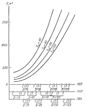 4.29. Максимальную водосборную площадь F, м2, приходящуюся на один водосточный стояк, выполненный из ПВП, ПНП и ПВХ диаметром 75-125мм типа Л, СЛ и С, следует определять по графикам на рис. 14 в зависимости от интенсивности дождя в л/с с 1 га для данной местности продолжительностью 20 мин при периоде однократного превышения расчетной интенсивности, равной одному году (q20). 4.30. Для прокладки водосточных стояков из ПВП следует предусматривать соединения с резиновыми уплотнительными кольцами, из ПВХ - клеевые и соединения с резиновыми уплотнительными кольцами. Трубы из ПНП в системах внутренних водостоков следует применять в виде бухт-стояков полной заводской готовности. Допускается сварная конструкция бухт-стояков из труб диаметром 75 и 90 мм типа СЛ. 4.31. Для компенсации температурных удлинений водосточных стояков из ПВХ с клеевыми соединениями необходимо предусматривать одно компенсационное соединение с резиновым уплотнительным кольцом на пять-восемь этажей. Компенсацию температурных удлинений стояков из ПНП следует предусматривать за счет укладки труб «змейкой» в штробах и шахтах.