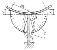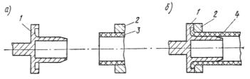 Рис. 16. Схема формования отбортовки а - положение до формования; б - положение по окончании формования; 1 - дорн; 2 - прижимной фланец; 3 - труба; 4 - труба с отбортовкой