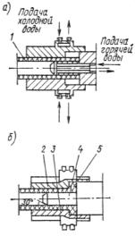 Примечание. Длину дорна l следует принимать равной глубине раструба фасонной части плюс 1 мм, а глубину гильзы - равной длине дорна. валиков после сварки должна быть не более 2-2,5 мм при толщине стенки трубы до 5 мм и не более 3-5 мм при толщине стенок 6-20 мм. 8.7. Для соединения труб из ПНП с раструбными фасонными частями и труб из ПНП, ПВП нПП с формованными раструбами следует применять контактную раструбную сварку, которая осуществляется при помощи металлического нагревательного приспособления, состоящего из гильзы для оплавления наружной поверхности конца трубы и дорна для оплавления внутренней поверхности раструба (рис. 19).