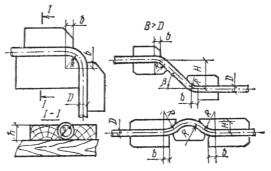 7.32. При гнутье на трубогибочных станках зазор между обкатывающим роликом и трубой должен быть не более 10% размера наружного диаметра трубы. Скорость гнутья должна составлять 2-4 об/мин. При гнутье труб по шаблону (рис. 18) следует принимать: Н ³ 0,7D; b ³ D; R ³ 4D. 7.33. При угле изгиба 90° трубы следует перегибать на 6° для ПНП и на 10° для ПВП и ПП. При других углах изгиба следует рассчитать величину перегиба исходя из указанных выше значений. Отклонение угла изгиба от заданного не должно превышать ±3°.