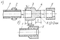 Рис. 19. Приспособление для контактной раструбной сварки полиэтиленовых труб и фасонных частей а - положение до начала сварки; б - положение после сварки; 1 - труба; 2 - ограничительный хомут, 3 - гильза приспособления; 4 - дорн приспособления; 5 - раструб фасонной части Размеры дорна при раструбной сварке пластмассовых труб приведены в табл. 14. Для каждого диаметра труб и фасонных частей требуются отдельное приспособление или съемный комплект гильз и дорнов, изготовляемых из стали марки 45 или дюралюминия марки Д16. 8.8. Контактная раструбная сварка включает следующие операции: установку ограничительного хомута на расстоянии от торца трубы до края хомута, равном глубине раструба фасонной части плюс 2 мм. При этом внутренний диаметр хомута должен приниматься на 0,2 мм меньше номинального наружного диаметра свариваемой трубы; установку раструба на дорне; установку гладкого конца трубы в гильзе до упора в ограничительный хомут; нагрев в течение заданного времени свариваемых деталей, одновременное снятие деталей с дорна и гильзы; соединение деталей между собой с выдержкой до отвердения оплавленного материала. При сварке поворот деталей относительно друг друга после сопряжения деталей не допускается. После каждой сварки необходима очистка рабочих поверхностей дорна и гильзы от налипшего полиэтилена или пропилена. 8.9. Основные параметры, определяющие прочность раструбного сварного соединения, - температура нагревательных элементов и продолжительность нагрева деталей - приведены в табл. 15. Таблица 15