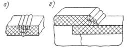 Рис. 21. Порядок укладки сварочных прутков в шов а - при стыковом соединении, б - при соединении в раструб нагрев свариваемых поверхностей должен производиться равномерно до появления на поверхности мелких пузырьков и небольшой волны расплавленной массы прутка и основного материала; сварочный пруток нагревается до более высокой температуры, чем соединяемые, поверхности; угол наклона прутка при подаче его в шов должен быть равен 90°; сила вдавливания прутка в шов должна составлять 14-16 Н (1,4-1,6 кгс) для одинарного сварочного прутка 3 мм и 24-26 Н (2,4-2,6 кгс) для сдвоенного прутка сложного профиля 6Х3 мм; расстояние от наконечника горелки до свариваемых поверхностей должно быть равно 5-10 мм; угол наклона наконечника горелки к поверхности сварного шва должен быть равен 20-45°; правильное распределение тепла осуществляется за счет непрерывного покачивания сопла-горелки и подачи струи горячего воздуха попеременно на пруток и свариваемые поверхности; корень шва должен быть проведен одинарным прутком диаметром 3 мм; средняя скорость укладки сварочного прутка диаметром 3 мм должна составлять 12-15 м/ч; для обеспечения равномерного распределения напряжений в шве укладку прутков в соединении следует выполнять в последовательности, показанной на рис. 21; вытяжка сварочного прутка, уложенного в шов, не должна превышать 20%. 8.25. Механические испытания образцов на растяжение, в соответствии с п.п. 8.17 и 8.18, следует производить в случаях, указанных в п. 8.13. Примечание. Допускаемое давление в трубопроводе из ПВХ при наличии сварных фасонных частей следует принимать не более 50% от номинального для применяемого типа трубы. 8.26. При работе на открытом воздухе следует руководствоваться п. 8.19, температура окружающего воздуха при сварке ПВХ должна быть не ниже +5° С. 9. Изготовление сварных фасонных деталей9.1. Применение сварных фасонных частей из труб (отводов, колен, тройников, крестовин и переходных тройников) допускается при отсутствии соответствующих частей, изготовленных методом литья.