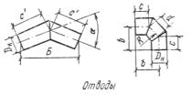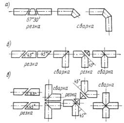 Рис. 22. Схема процесса изготовления фасонных частей контактной стыковой сваркой а -отводов и колен, б - тройников; в - крестовин 9.2. Фасонные части для труб из ПВП, ПНП и ПП следует изготовлять контактной стыковой сваркой, а для труб из ПВХ - газовой прутковой сваркой. 9.3. Технология изготовления отводов, колен, тройников и крестовин для труб из ПВП, ПНП и ПП контактной стыковой сваркой включает следующие операции (рис. 22): резку труб на заготовки; очистку концов труб от загрязнений и торцовку; сварку (отводов и колен); отрезку вершины угольника (для тройников и крестовин); сварку (тройников и крестовин); 9.4. Для изготовления фасонных частей контактной стыковой сваркой следует применять специальное оборудование и приспособления, обеспечивающие правильное взаимное расположение деталей, при этом должны соблюдаться требования, изложенные в п. 8.3. Для торцовки следует использовать двустороннюю фрезу, снабженную сменными резцами. 9.5. При изготовлении тройников и крестовин отрезать вершину сваренного угольника и приваривать к нему трубу или сваривать угольники между собой необходимо после полного остывания предыдущего сварного шва. При отрезке вершины угольника линию реза необходимо смещать на 2-2,5 мм от точки пересечения осей в сторону вершины угольника (рис. 23) для компенсации осадки труб при оплавлении и сварке. 9.6. Сварные отводы, как правило, должны иметь от одного до трех секторов. Радиус кривизны сварного отвода должен составлять 1-1,5 наружного диаметра трубы.